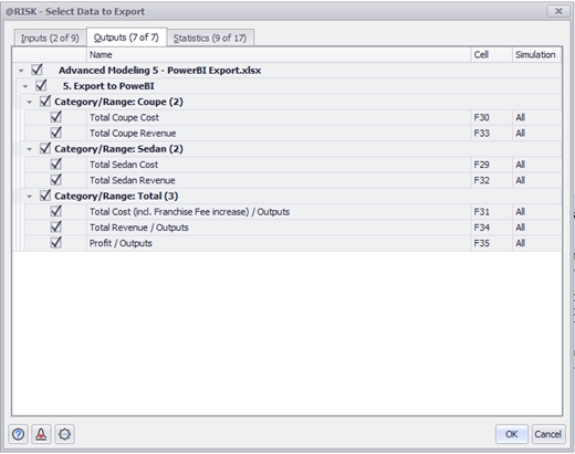 选择要导出的数据窗口显示您打开的@RISK模型中的所有输入和输出。您可以选择要包含的变量,从常用统计列表中选择要导出的计算值,并指定每个输出要导出的敏感性分析——支持在BI仪表板中创建tornado图。