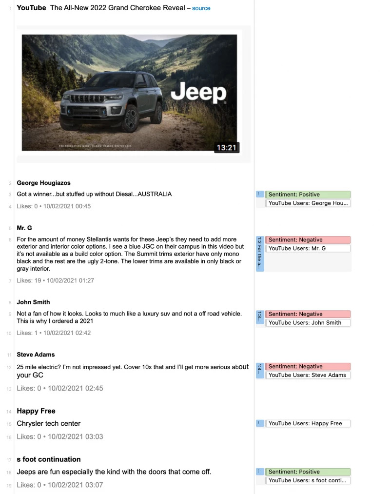 支持的社交网络有脸书、推特、Instagram、YouTube、TikTok、VK、Twitch、Discord、Steam。下面您看到的是从YouTube上导入的关于2022款吉普大切诺基的社交网络对话。ATLAS.ti自动编码所有用户。此外,还进行了情感分析,寻找积极和消极的陈述。