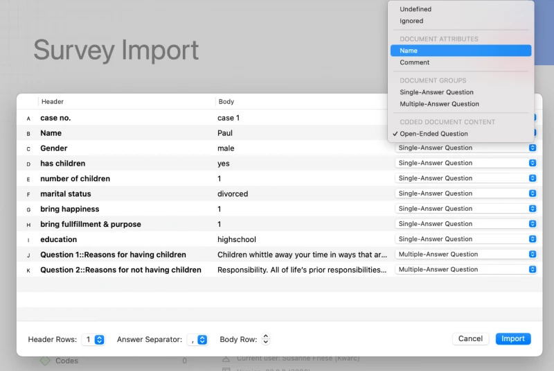 对于那些处理调查数据的人来说,这是个好消息。我们简化了调查数据的导入;导入前不再需要添加任何语法。您可以导入从Google Forms、Survey Monkey、Qualtrics等导出的数据。在向导的帮助下,您可以决定应该包括或排除哪些数据,应该转换哪些数据。