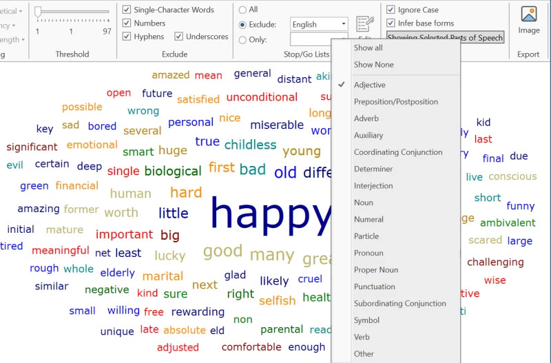 词云和列表获得了进一步的过滤选项。按词性过滤允许您按特定的语法元素(词性)过滤数据,如形容词、名词、数字、代词等。下面是一个只显示形容词的例子:
