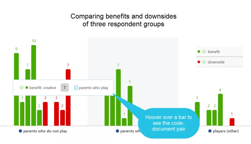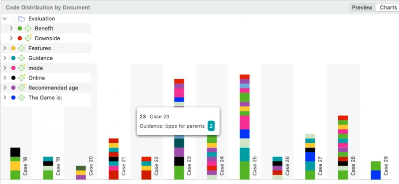如果您将鼠标悬停在一个条形上,将显示代码标签及其频率。如果您双击一个条柱,引文阅读器打开,您可以读取由该代码编码的数据。