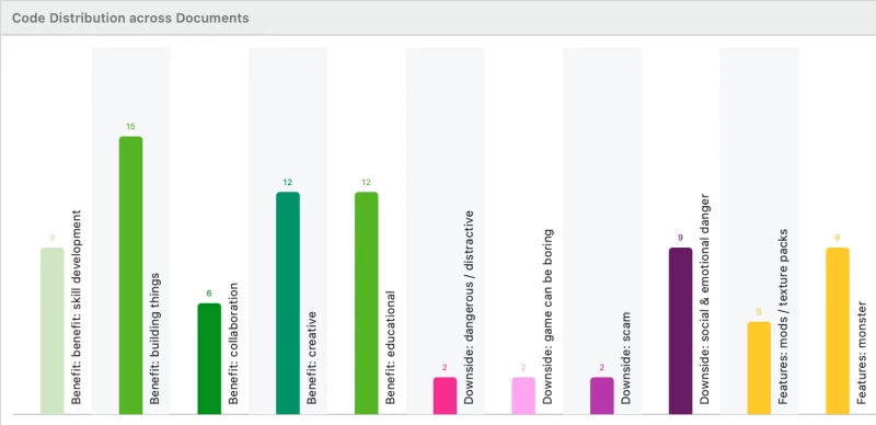 在对数据进行编码之后,查看一下代码分布就可以对数据有所了解。哪些话题被提及的频率或多或少,被谁提及,不同群体的受访者之间是否存在差异?主题是如何分布的?代码分布显示在文档管理器和代码管理器中。
