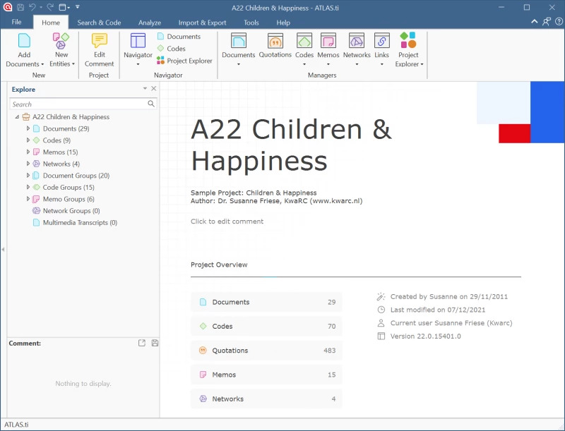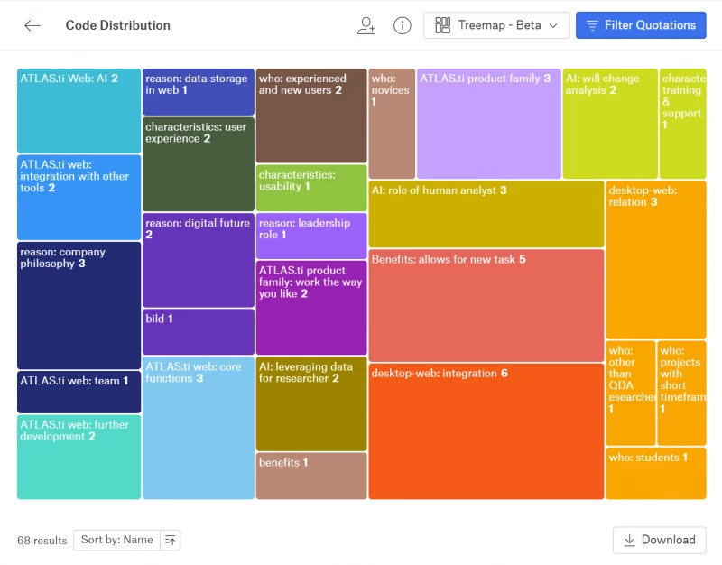 我们在ATLAS.ti Web中添加了很棒的新可视化功能(参见上面的环形图和树形图示例),以及从Windows和Mac版本导入ATLAS.ti 22项目的可能性。