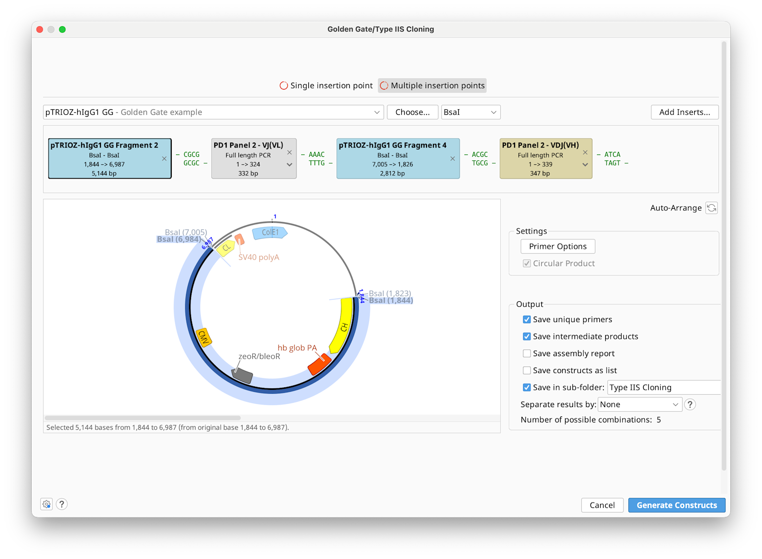 使用 Gibson、In-Fusion 和 Golden Gate 克隆,可以在一个步骤中将片段插入到骨架载体的多个位置。圆形骨架可以在不同位置进行酶切,创建多个插入点。