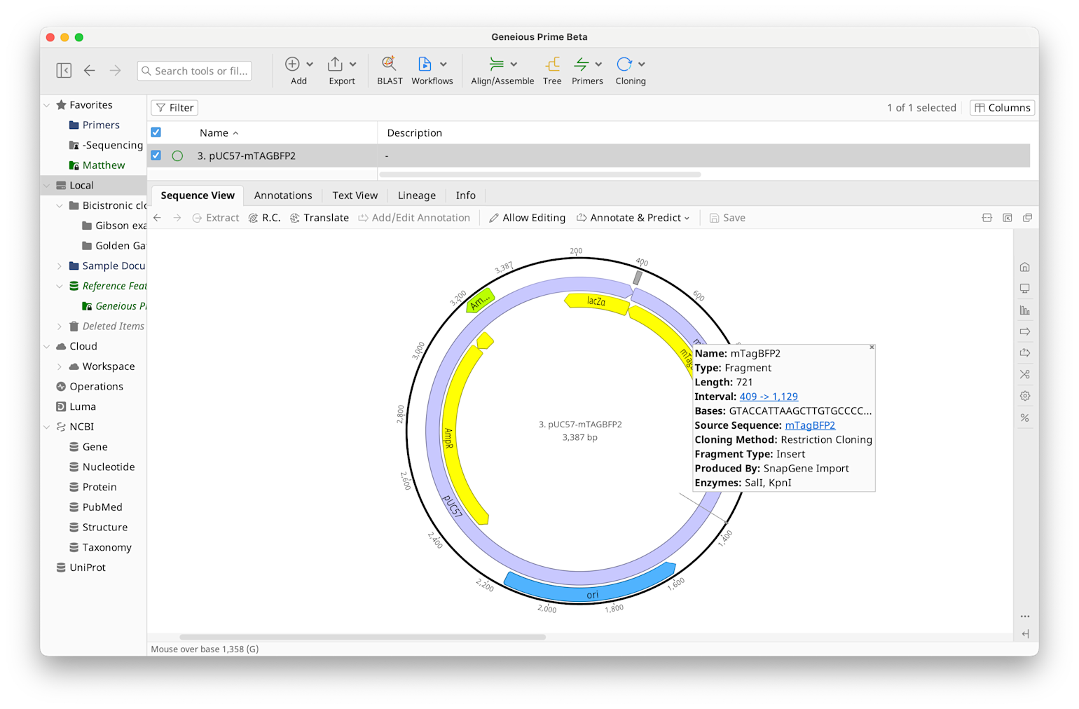 导入 SnapGene *.dna 文件现在会为第一级历史记录创建片段注释,显示某些克隆类型的模拟方法记录,并支持直接在 Geneious Prime 中恢复父文件。