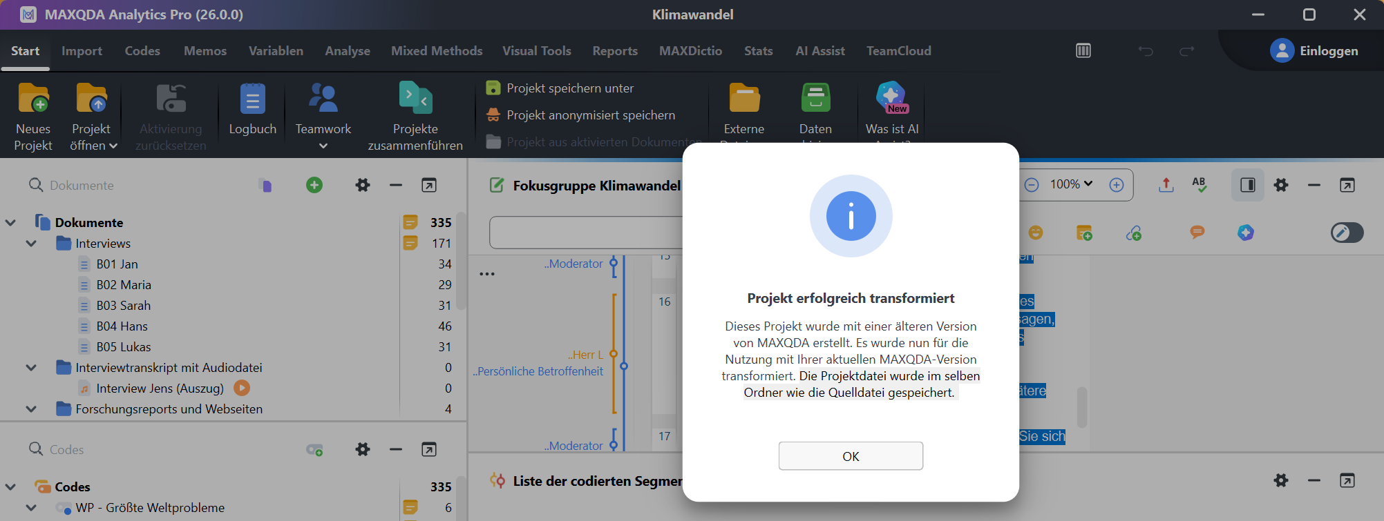 当您打开所需项目时,项目文件将被转换为新的 .mqda 格式。
