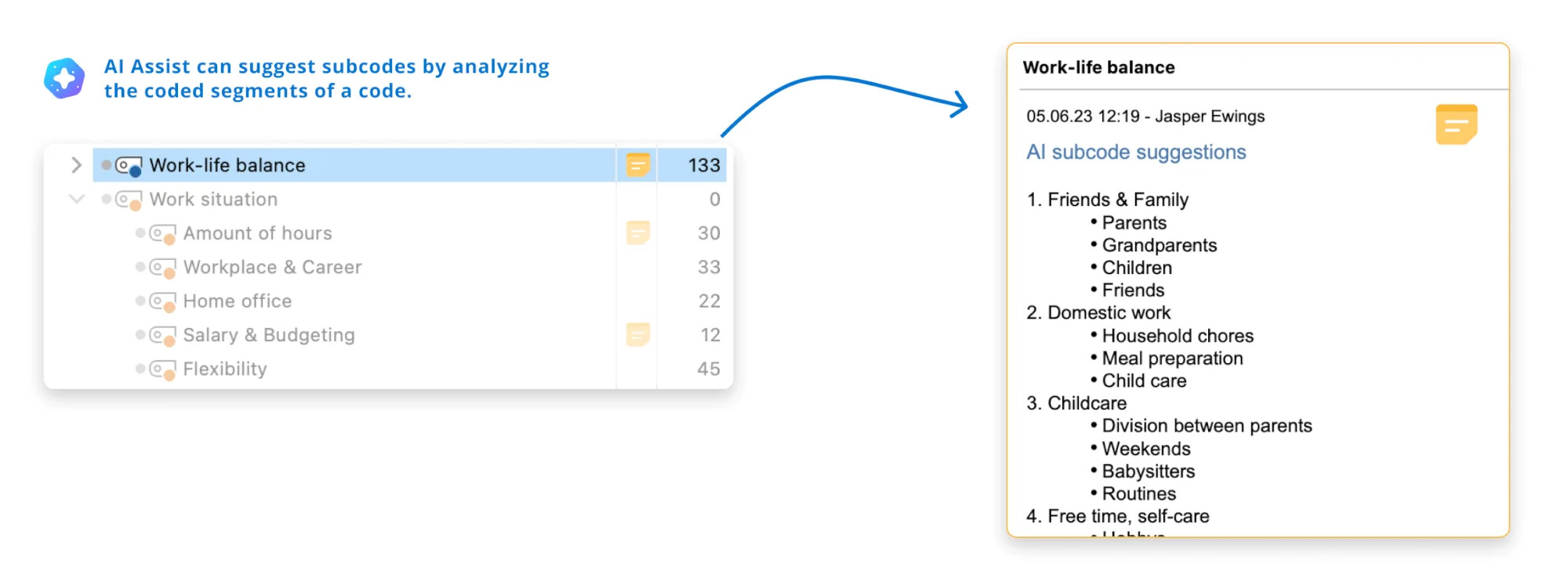MAXQDA 2022.7版最新更新(2023年6月8日) MAXQDA 2022.7版更新已经发布在更新 2022.6 中,我们推出了 AI Assist,您的智能内置助手 – 由 OpenAI 提供支持,作为免费测试版本。直到今天,AI Assist 仍能够帮助您汇总 MAXQDA 中不同位置的编码数据。通过今天的更新,AI Assist 获得了多项新功能,这些功能增强了其提高生产力和支持您的研究工作的能力。要将 AI Assist 添加到您的 MAXQDA 安装中,请在maxqda.com/ai-activation上注册免费测试计划。 更新一览AI辅助变得更强大建议子代码AI Assist 可以通过分析编码段的内容来帮助您开发代码的子类别。使用此功能可以更广泛地了解编码数据及其包含的主题,并找到可能的子代码的灵感。您还可以使用此功能将您已经开发的子代码与人工智能的建议进行比较。