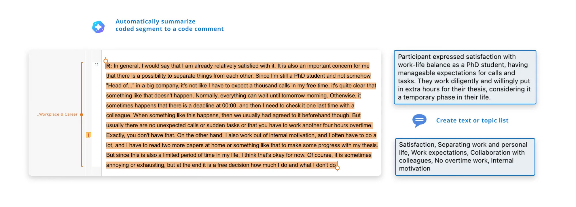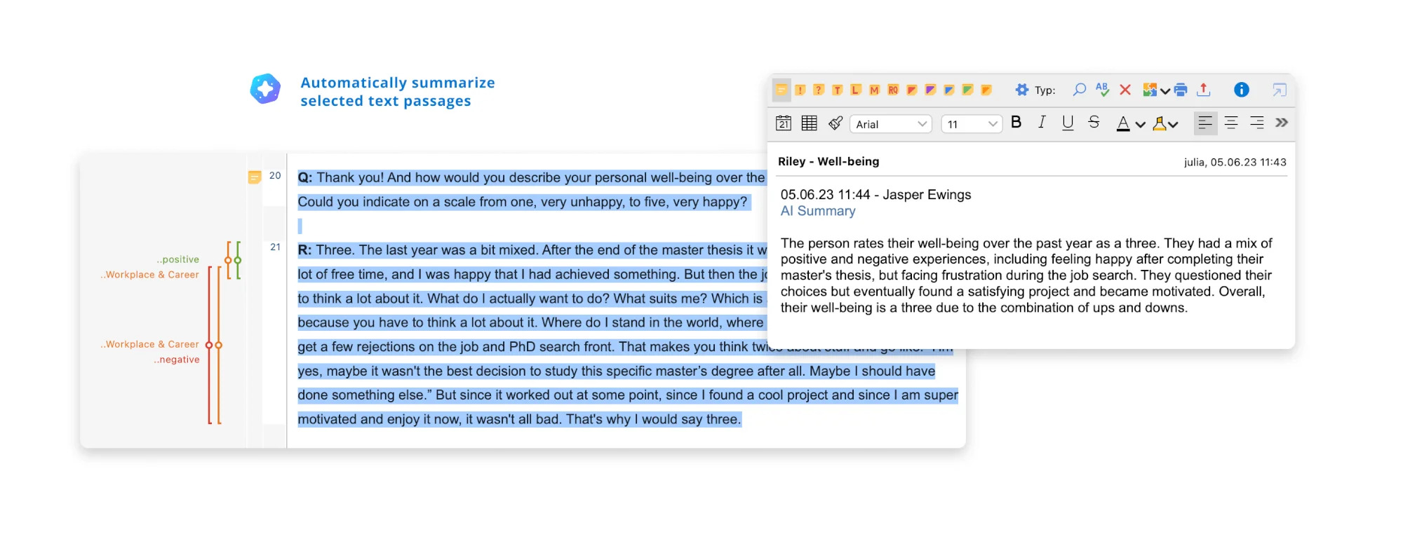 ![]() 总结选定的文本段落AI Assist 已经能够为您总结用特定代码编码的多个片段的内容。现在,您还可以直接在文档浏览器中总结文本段落或总结单个编码段。
