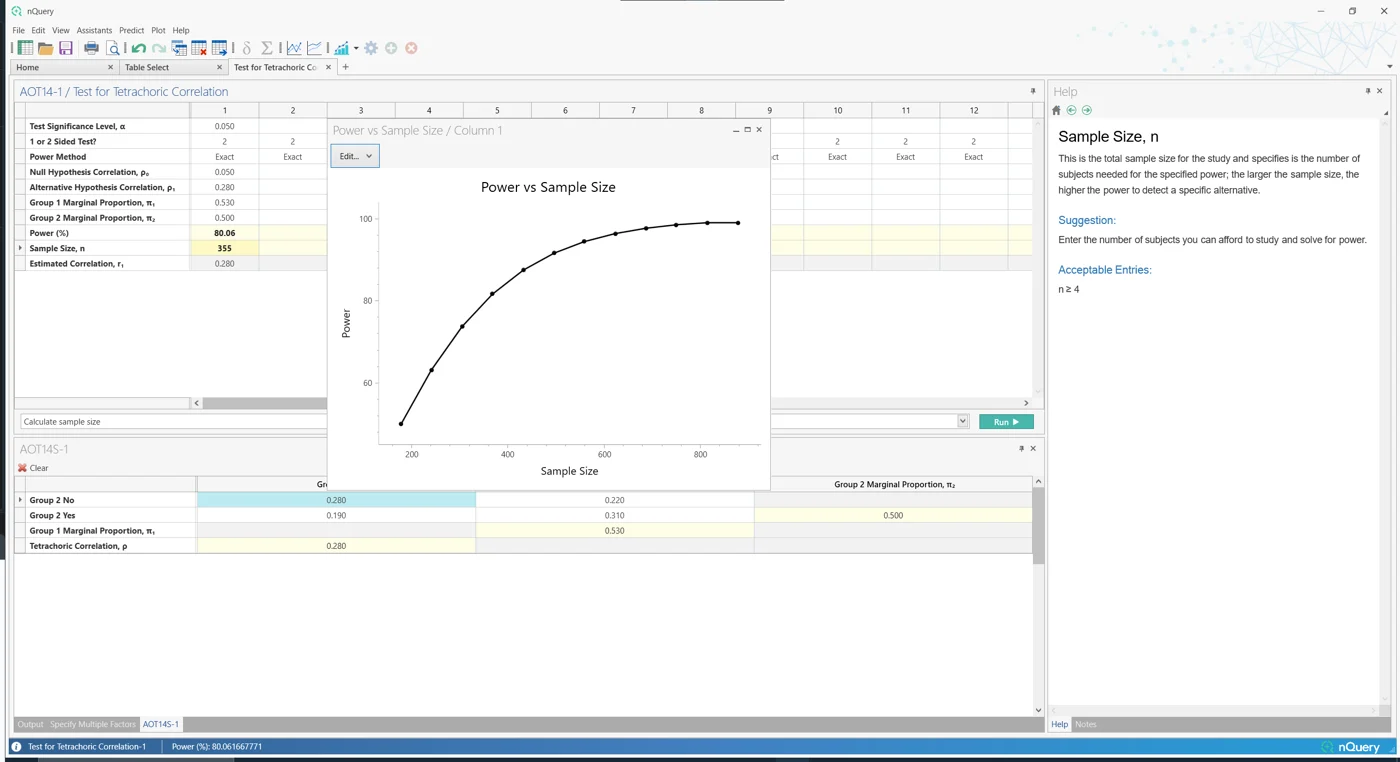 在 nQuery 9.6 中,添加了四分相关表,可用于评估使用二分数据测量的两个连续变量之间的关系。