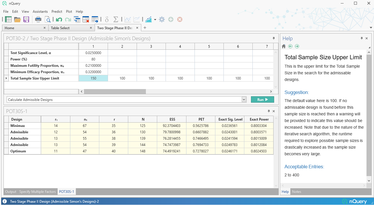 首先,添加了一个表格,用于查找完整的"可接受"设计集合——这些设计在最大和预期样本量之间取得平衡,并提供超出最优设计和极小极大设计的更多潜在设计选项。