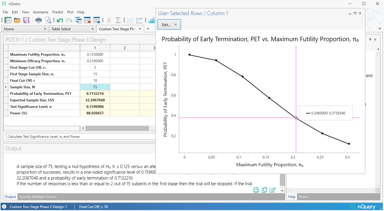 其次,添加了一个完全自定义的二阶段表格,允许指定任意的停止规则集,然后允许计算该设计的经验I类/II类误差。我们还在现有的Simon设计表格(POT11)中添加了"自定义"选项,允许用户找到总样本...
