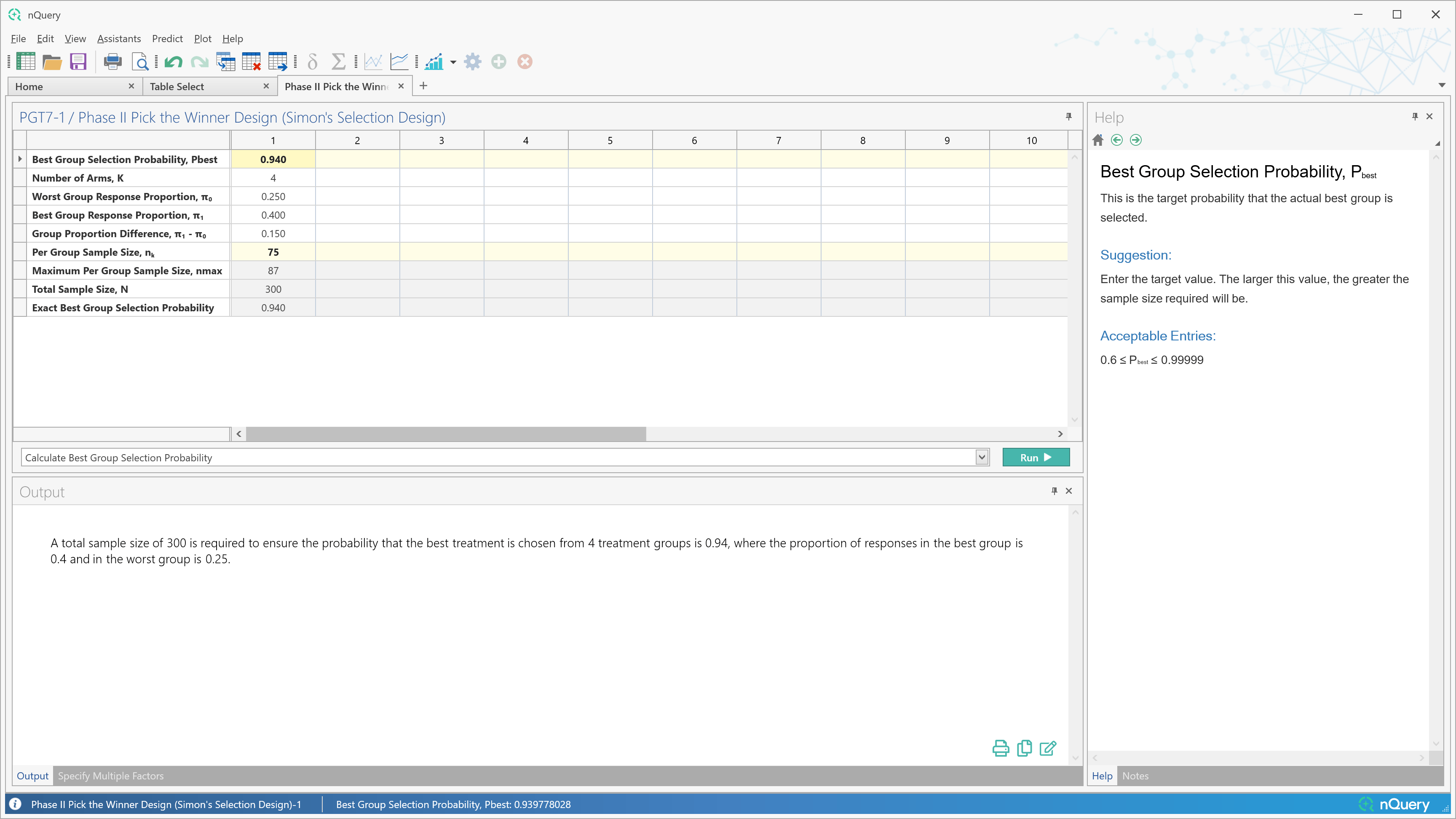 他们的论文还推导出了给定设计选择最佳组的概率所需的精确计算。在 nQuery 9.6 中,此计算用于根据选择最佳组的目标概率推导II期Simon随机化设计的样本量确定。
